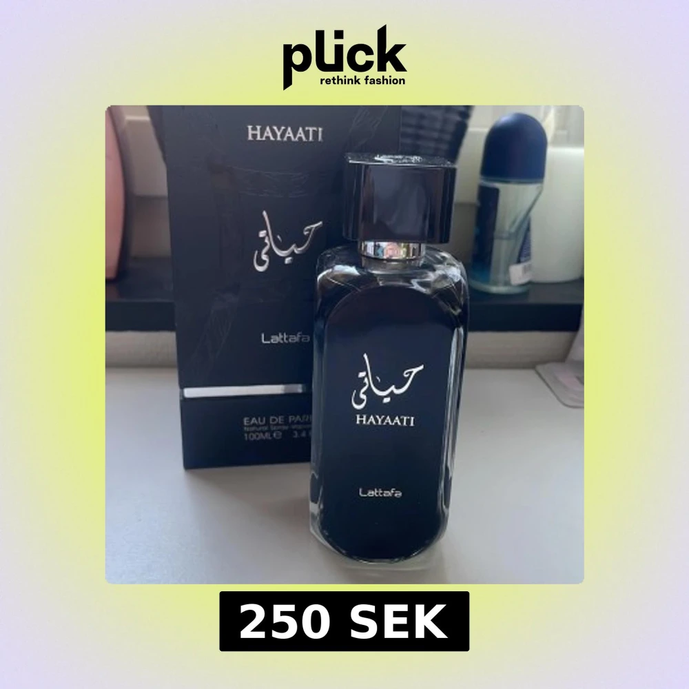 Elegant och mystisk parfymflaska i svart med silverdetaljer. Hayaati från Lattafa erbjuder en unik doftupplevelse. Flaskan rymmer 100 ml och har en stilren design med arabiska och engelska inskriptioner. Perfekt för den som söker en sofistikerad doft. Endast testad!