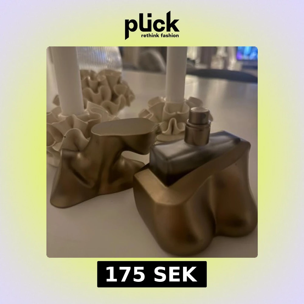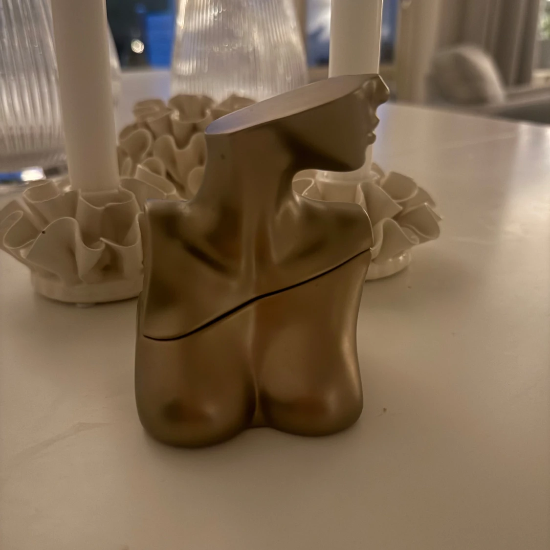 Unik parfymflaska i form av en stiliserad kvinnlig byst i matt guld. Flaskan har en konstnärlig och modern design med mjuka former och är tillverkad i glas och metall. Perfekt som statement-piece på sminkbordet.