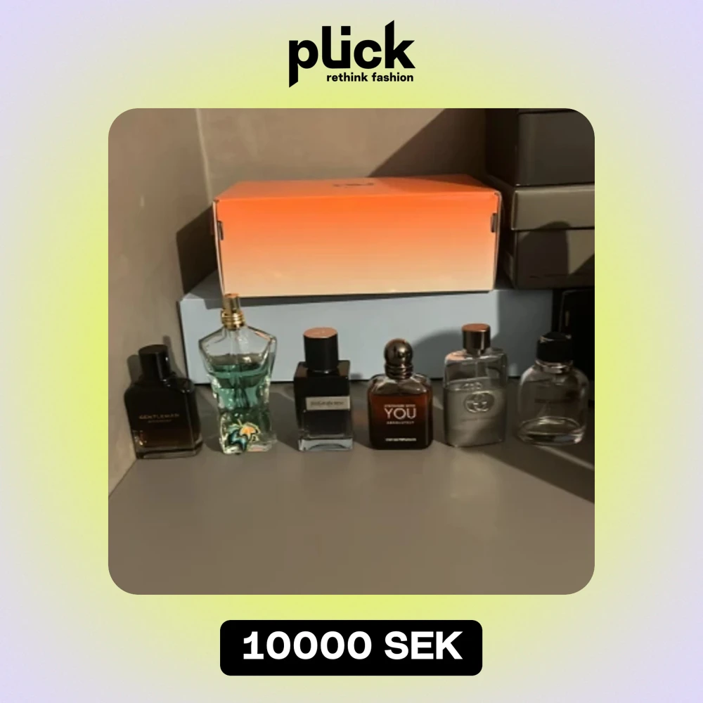 En samling av olika parfymer i snygga flaskor. Det finns en flaska med en unik form som liknar en kropp, en annan med en elegant svart design och en med en stilren, genomskinlig flaska. Märkena varierar och flaskorna har olika färger och former, vilket ger en känsla av lyx och variation.