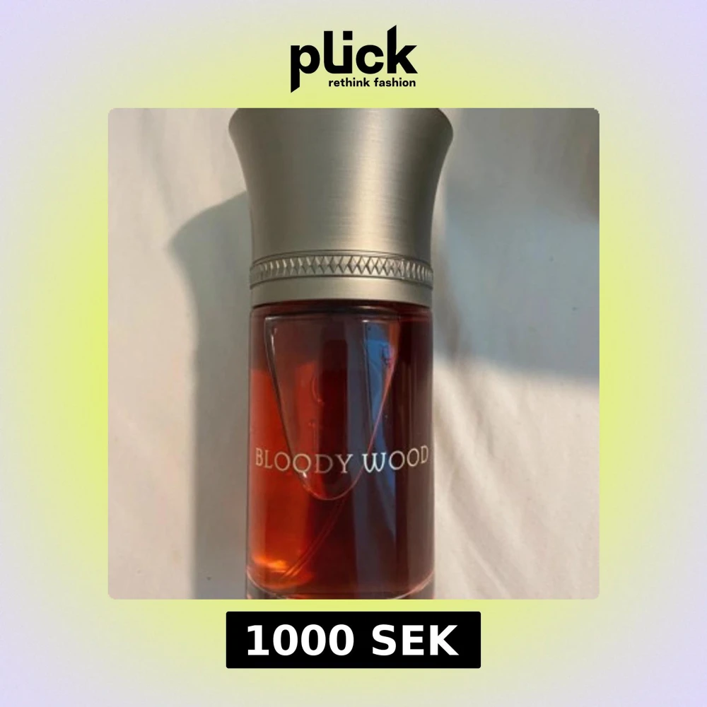Bloody Wood Eau Sanguine från Liquides Imaginaires är en unik parfym i en lyxig, cylindrisk glasflaska med röd vätska och en elegant silverfärgad metallkork. Kommer i en stilren svart box med märkets logga och detaljerad etikett.