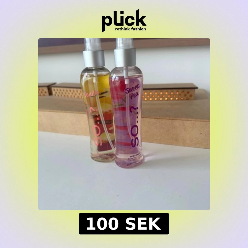 Två fräscha body mists: Vanilla och Sweet Pea. Perfekta för att snabbt fräscha upp dig under dagen. Volym: 100 ml per flaska. Ingredienser inkluderar alkohol denat., vatten, parfym och propylene glycol. Tillverkad i PRC.