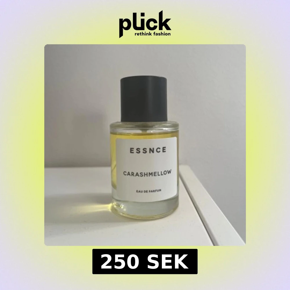 Säljer en flaska Essnce Carashmellow Eau de Parfum. Flaskan är rund med en svart kork och har en stilren etikett. Parfymen har en ljusgul färg och ger en känsla av elegans och sötma. Perfekt för den som älskar unika och mjuka dofter.