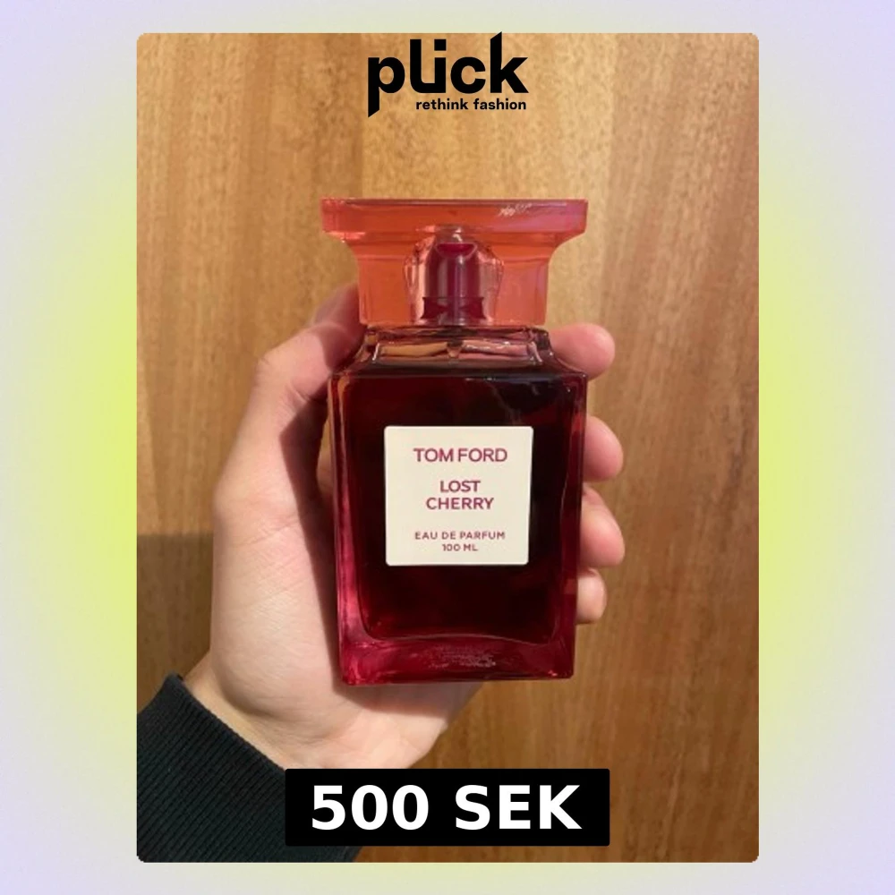 Tom Ford Lost Cherry Eau de Parfum i en lyxig, röd glasflaska på 100 ml. Flaskan har en fyrkantig form med en elegant etikett framtill och ett matchande rött lock. Doften är känd för sina söta och fruktiga körsbärstoner och exklusiva känsla.
