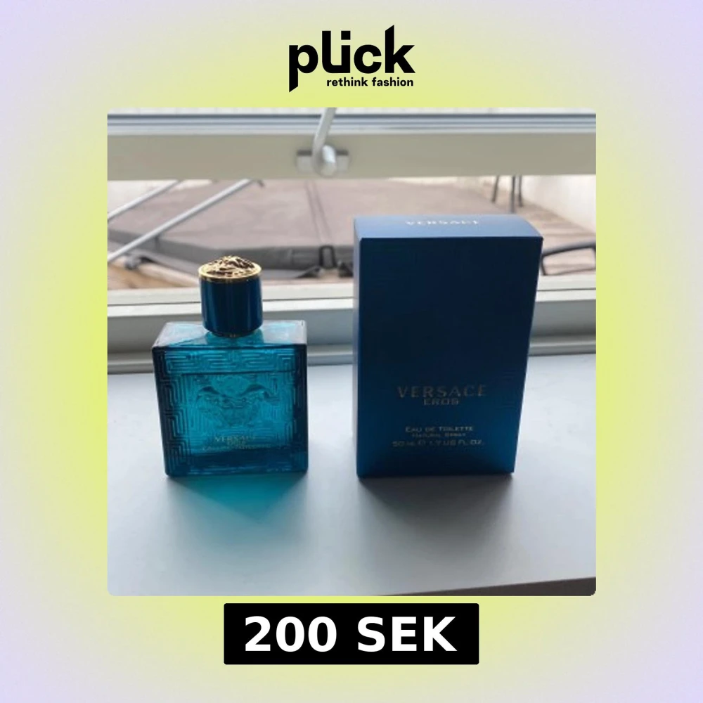 Versace Eros Eau de Toilette för herr, 50 ml. Flaskan är turkosblå med guldigt lock och har ett klassiskt Versace-mönster samt Medusa-huvudet på framsidan. Kommer med originalkartong i matchande blå färg med gulddetaljer. Kolla in min profil har fler parfymer