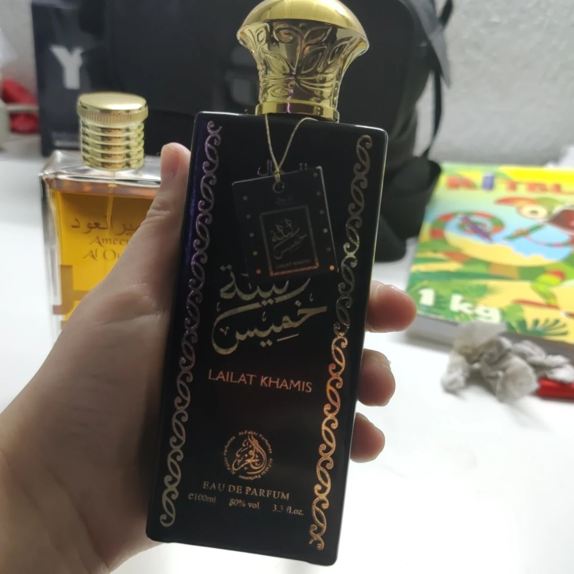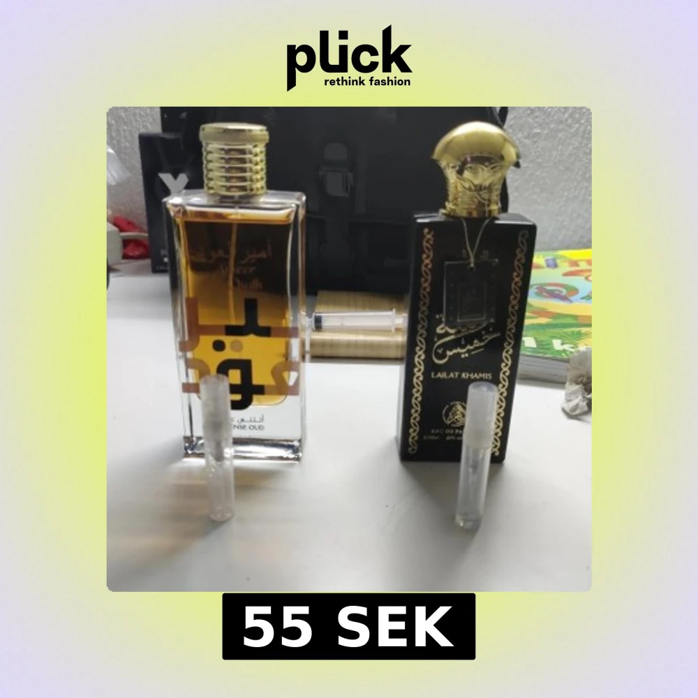 1 elegant parfym från Lattafa. Lailat Khamis kommer i en svart flaska med gyllene detaljer och en dekorativ kork. Intense Oud har en genomskinlig flaska med guldlock och svart text. Båda dofterna är Eau de Parfum och erbjuder en lyxig upplevelse.