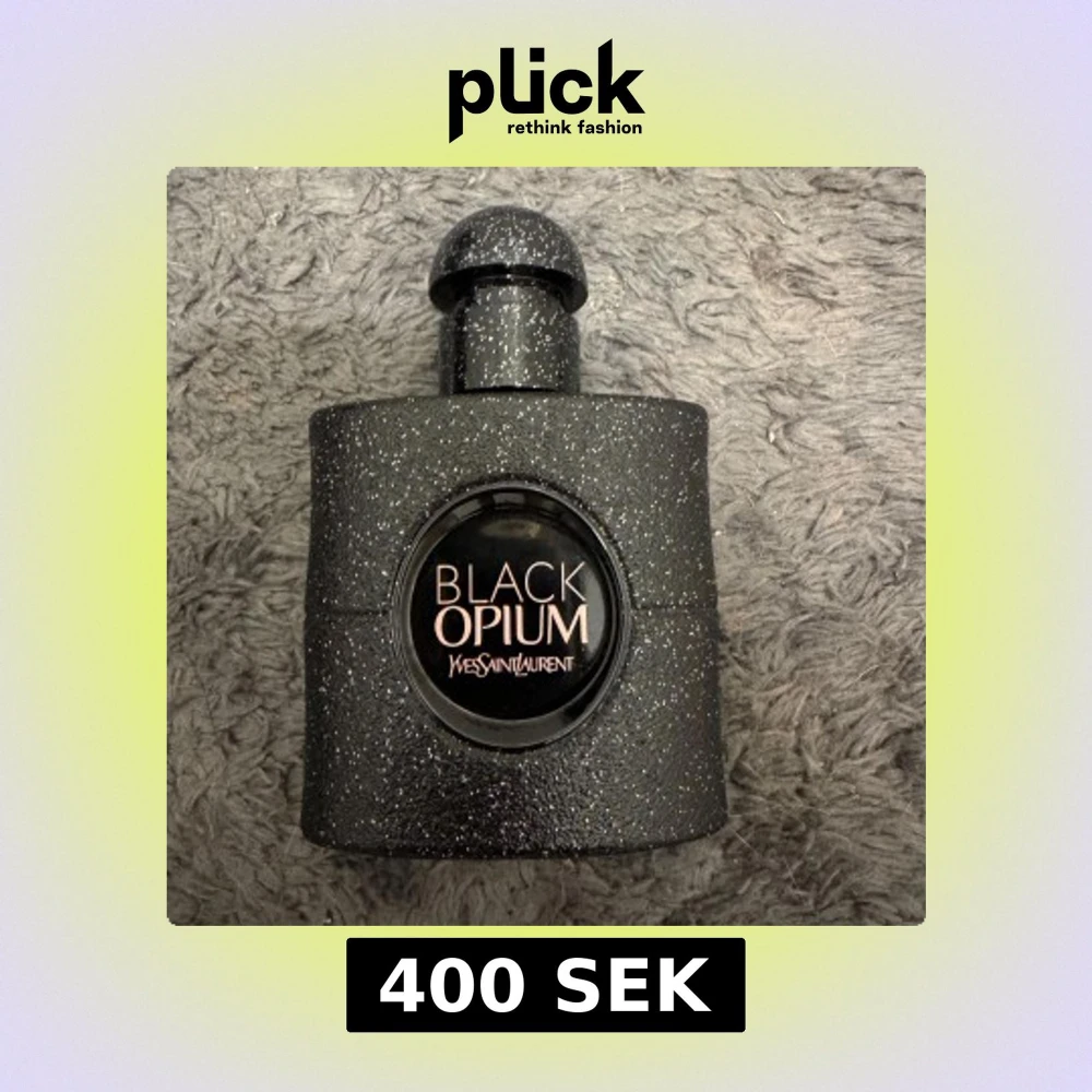 Säljer en ikonisk Black Opium parfym från Yves Saint Laurent. Flaskan är svart med glittrig yta och rund form, med tydlig logga framtill. Perfekt för dig som gillar lyxiga och trendiga dofter.