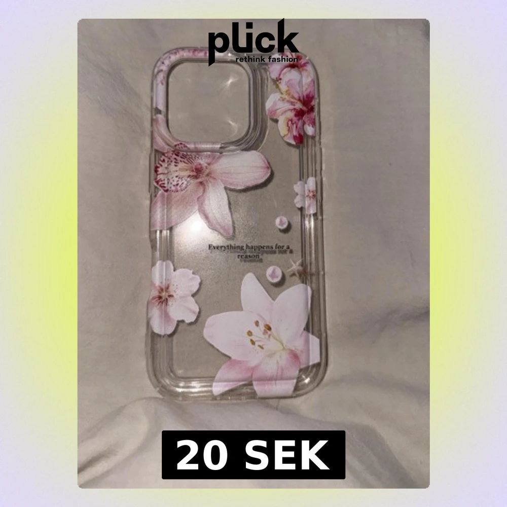 Snyggt genomskinligt mobilskal med rosa och vita blommor samt texten 'Everything happens for a reason' på baksidan. Skalets design är stilren och passar perfekt för dig som vill ha en personlig touch på mobilen.
