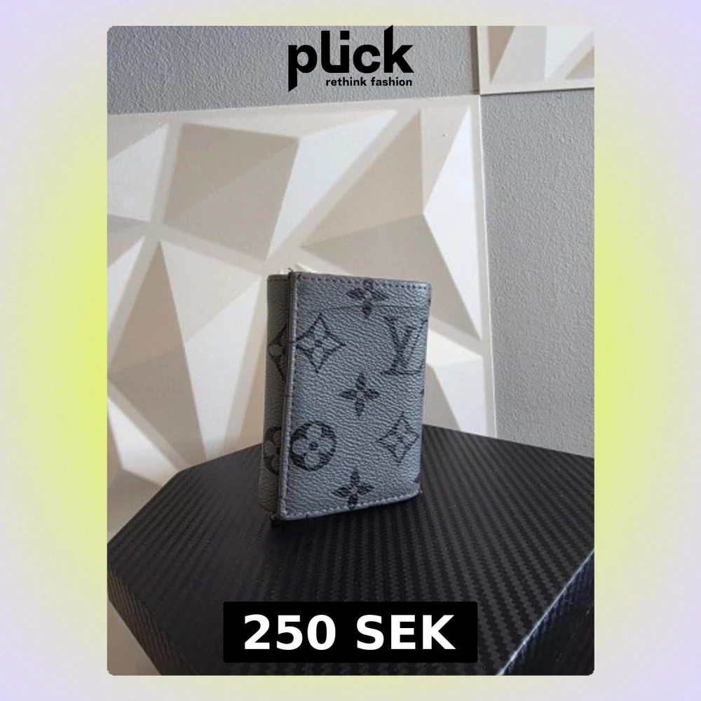 Snygg grå plånbok med klassiskt monogrammönster i svart. Plånboken är tillverkad i strukturerat läder och har en kompakt, rektangulär form. Perfekt för att organisera kort och kontanter med stil.