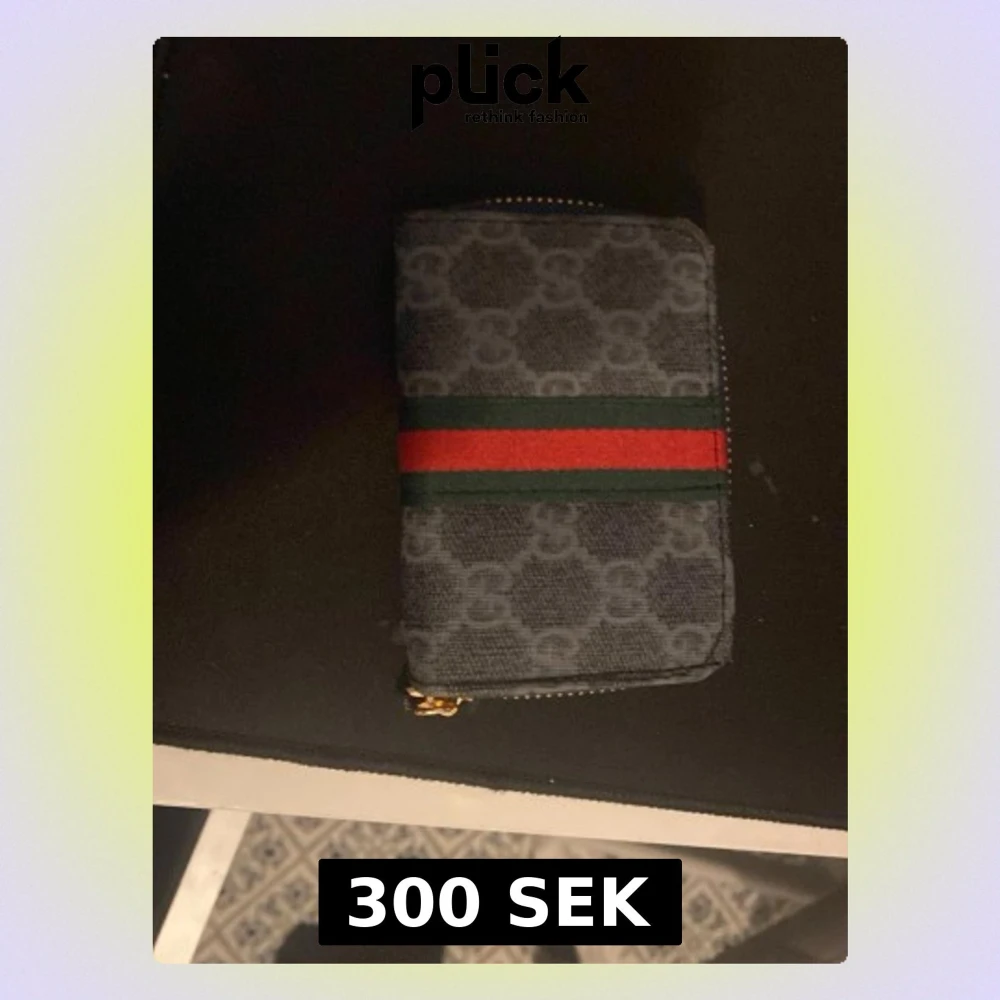 Snygg plånbok från Gucci i mörkgrått tyg med klassiskt GG-monogram. Plånboken har gröna och röda ränder på framsidan och dragkedja i guld. Perfekt för dig som gillar lyxiga accessoarer med ikonisk design.
