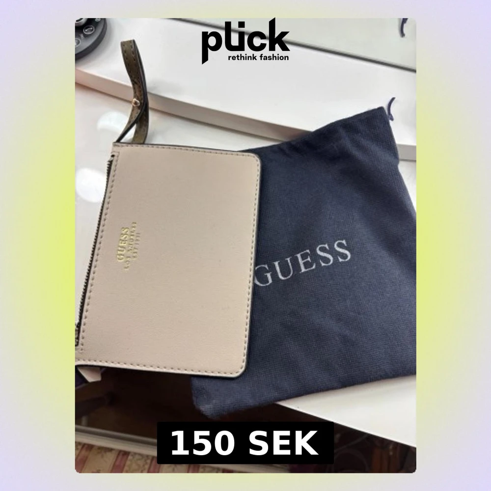 Snygg beige plånbok från Guess med guldfärgad logga framtill. Plånboken har dragkedja och går att fästa på väskan. Tillverkad i slätt konstläder och levereras med en mörkblå dustbag med Guess-logga.
