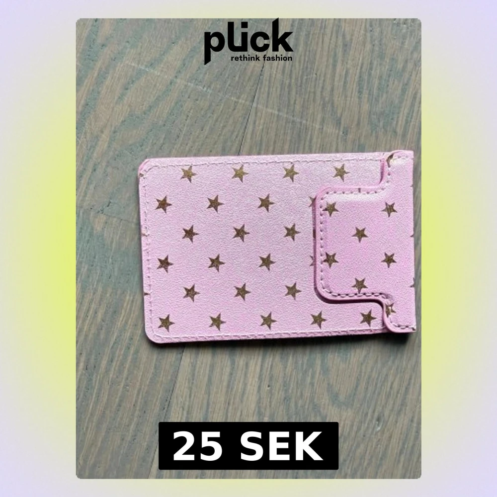 Snygg rosa korthållare i konstläder med små guldstjärnor över hela framsidan. Praktisk ficka framtill för extra kort eller sedlar. Baksidan har tejp för att fästa på mobilen eller annan yta. Perfekt för dig som vill ha koll på korten med stil.