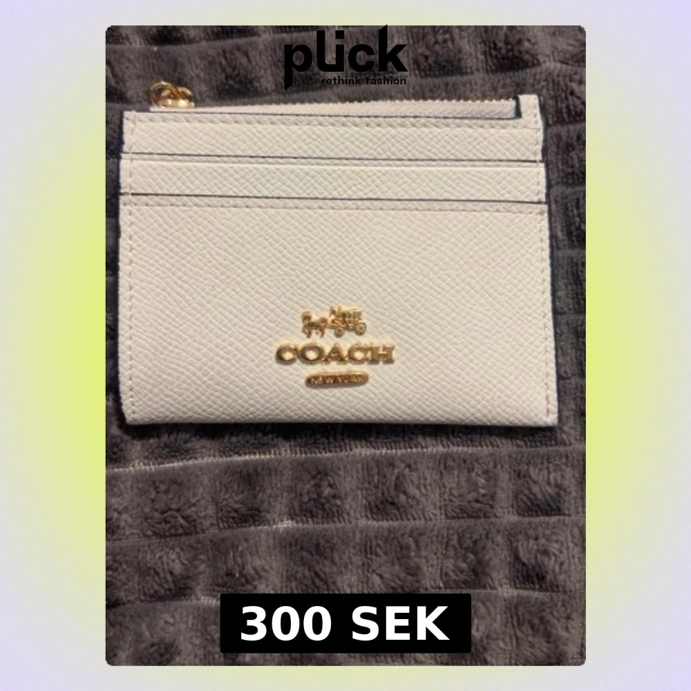 Snygg vit kortplånbok från Coach i strukturerat läder med guldfärgade detaljer och logga framtill. Plånboken har flera kortfack, dragkedjeförsett myntfack och ett genomskinligt fack på baksidan för ID eller busskort. Perfekt storlek för fickan eller väskan.
