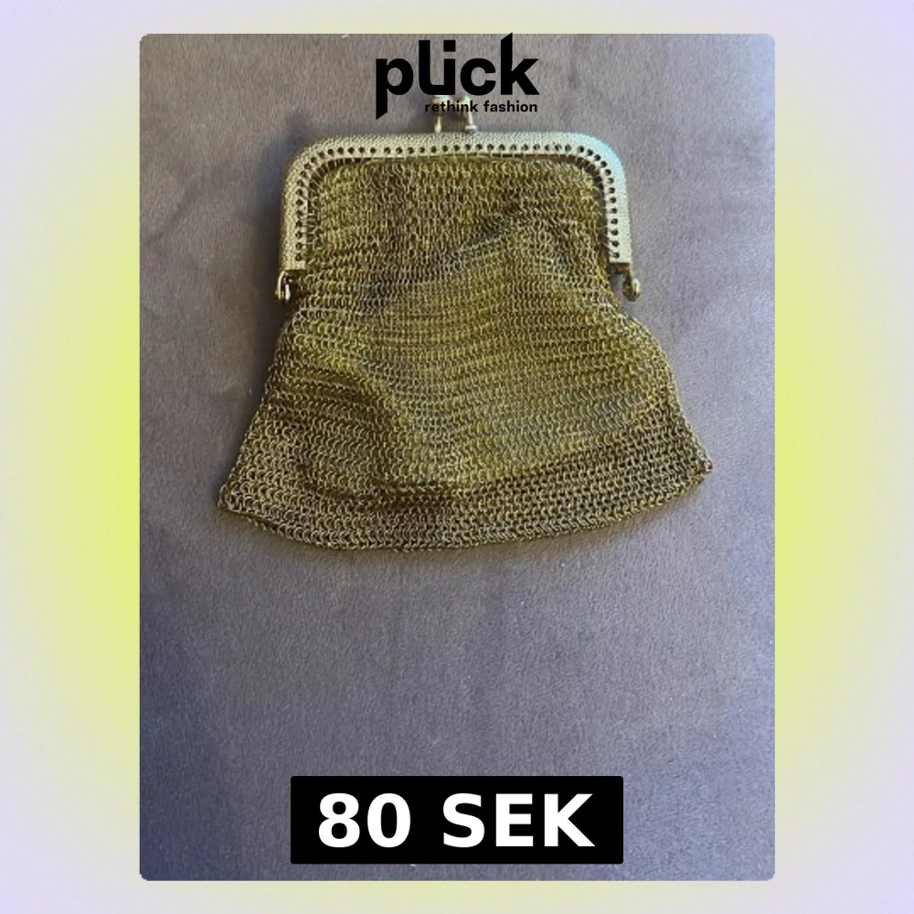 Säljer en liten plånbok i guldigt metallnät med klassiskt snäpplås. Plånboken har en unik vintagekänsla och är perfekt för mynt eller småsaker. Den har en mjuk, flexibel form och glänsande finish som sticker ut i mängden.