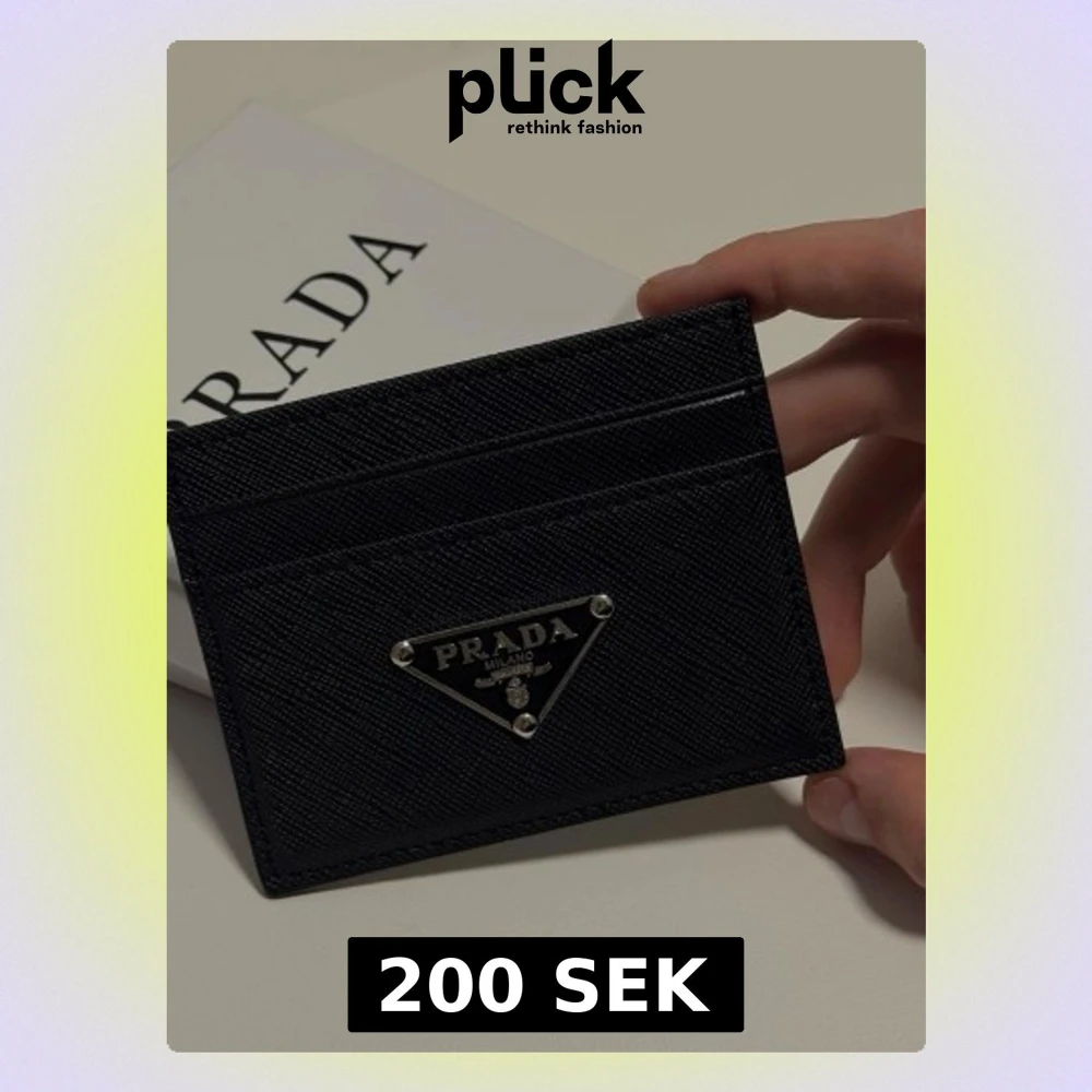 Snyggt svart kortfodral från Prada i läder med klassisk triangelformad metallogo framtill. Fodralet har flera kortfack och stilren design som passar perfekt i fickan.