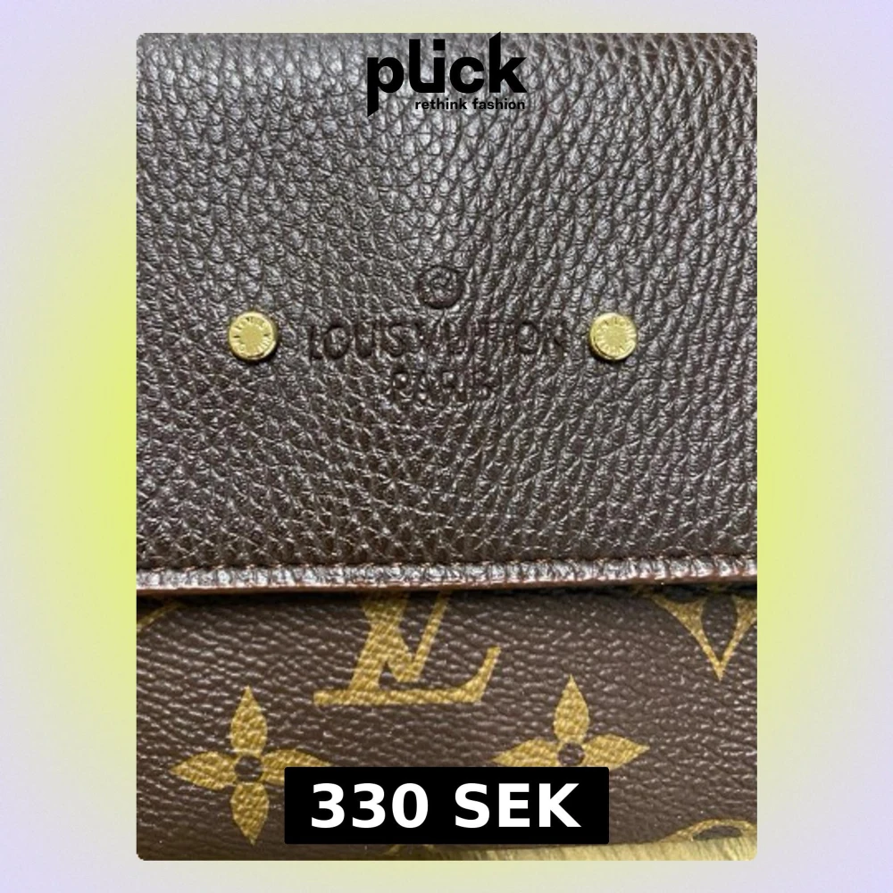 Plånbok med klassisk monogramdesign i guld. Jag är inte säker på om den är i äkta läder. Den har flera fack för kort och sedlar. Storleken är praktisk och lätt att ta med sig.