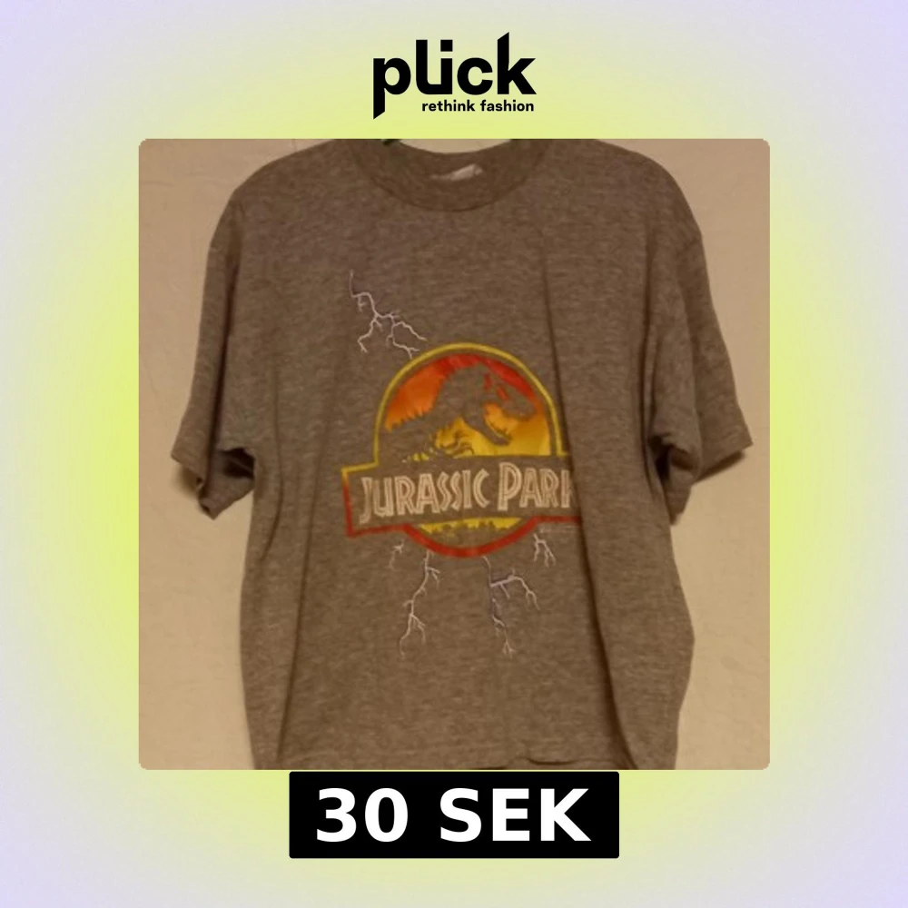 Cool grå t-shirt med Jurassic Park-logga i rött, gult och orange. Tillverkad i en bomull- och polyesterblandning. Perfekt för filmälskare! Storlek 122-128