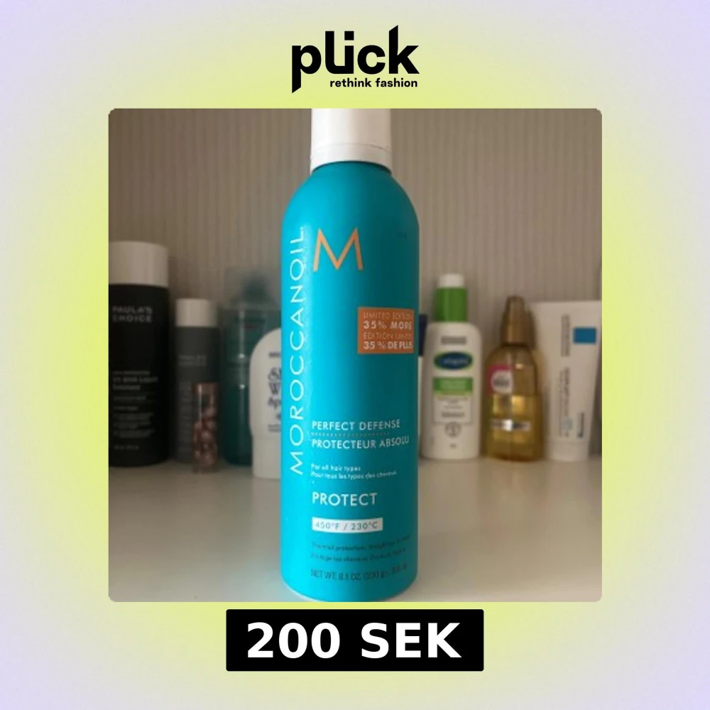 Moroccanoil Perfect Defense är en värmeskyddande spray i en turkos flaska med orange detaljer. Skyddar håret mot värme upp till 230°C. Innehåller 240 ml och passar alla hårtyper. Ca 70% kvar