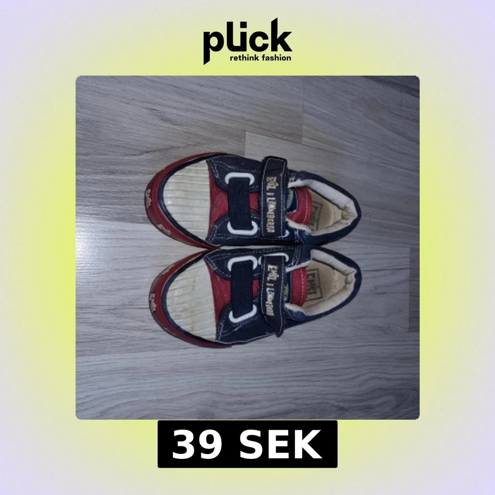 Säljer ett par blå och röda sneakers med kardborreband. Skorna har en vit sula och detaljer i rött och blått tyg. Perfekta för en avslappnad stil.