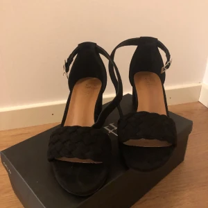 Svarta sandaletter stl 37/38 satin Nya - Högklackade festskor från H&M consious collection. Svart satin. Klackhöjd 10 cm. Stl 37, men stora i storleken, passar mig som är en 38:a. superfina på med rem runt vristen. Aldrig använda. Nypris 799:-