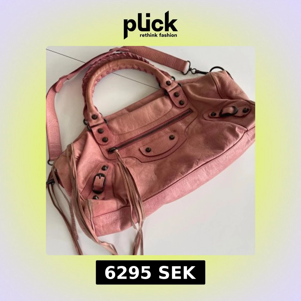 Rosa Balenciaga väska ”Twiggy” med flätat handtag och detaljer med nitar. Färgen är lite gammelrosa/laxrosa. Kommer med axelband. Tyvärr finns ingen spegel. Inget kvitto eller dustbag finns, bara väskan. Längd: 37 cm Bredd: 20 cm Djup: 11cm Väskan har tecken på användning, men är i fint skick. Handtagen är i jättefint skick, väskan har lite färgskiftningar och fläckar på lädret, samt slitningar på hörnen. Jättefint skick inuti. I övrigt är väskan hel och ren utan någon doft.