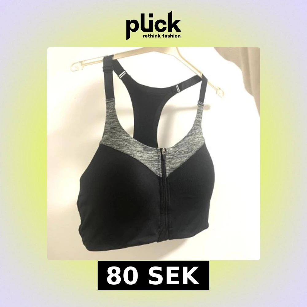 Snygg och funktionell svart sport-bh med grå detaljer och dragkedja framtill. Perfekt för träning med justerbara axelband och brottarrygg för extra stöd.