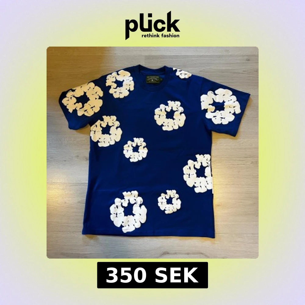 Snygg blå t-shirt från Denim Tears med stora vita blommor tryckta över hela tröjan. T-shirten har rund hals och korta ärmar. Perfekt för dig som vill sticka ut med en unik och trendig stil.