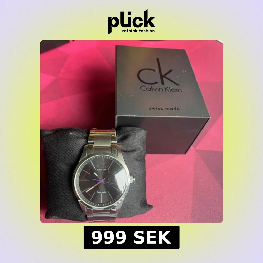 Snygg och stilren klocka från Calvin Klein i silverfärgat rostfritt stål. Den har en svart urtavla med minimalistisk design och blå sekundvisare. Klockan är Swiss Made och vattentålig upp till 10 bar. Perfekt för den som gillar en klassisk och elegant stil. Små repor i glaset som endast syns om man kollar nära. Ligger några fler band delar i lådan. Batteriet är nyss bytt.