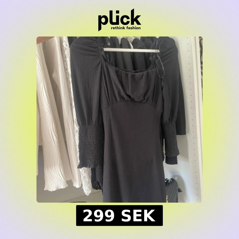 Säljer en svart klänning med fyrkantig ringning, puffiga långa ärmar och smockade ärmslut. Klänningen har en figurnära passform och är tillverkad i ett mjukt, ribbat material. Perfekt för dig som vill ha en stilren och trendig look.