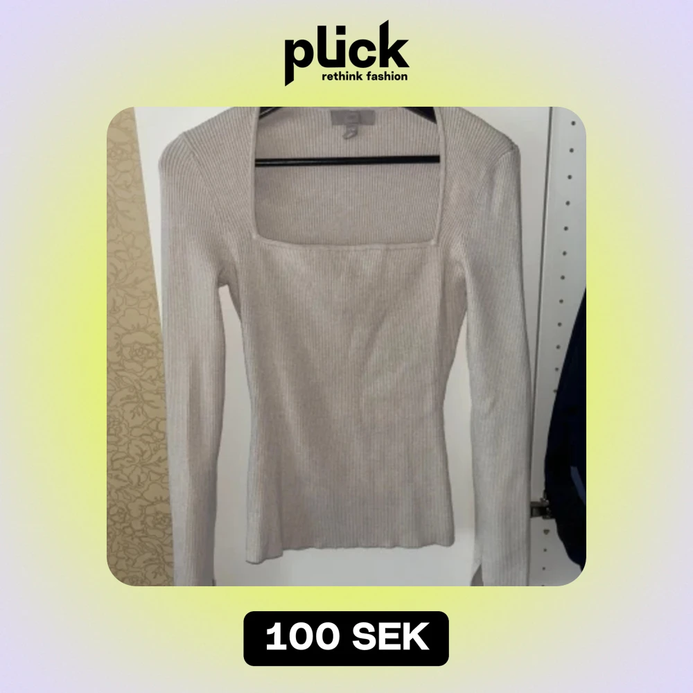 Vit/cremefärgad, ribbad, finstickad tröja från H&M med square neck. Helt nyskick, använd fåtal gånger. Köptes för 249:-, säljer för 90:-.