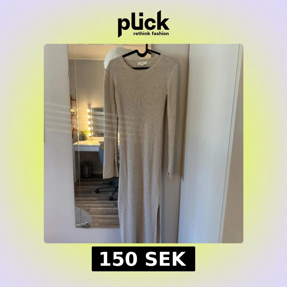 Snygg beige långklänning från H&M i ribbat material. Klänningen har långa ärmar och går ända ner till fötterna. Perfekt för både vardag och speciella tillfällen.