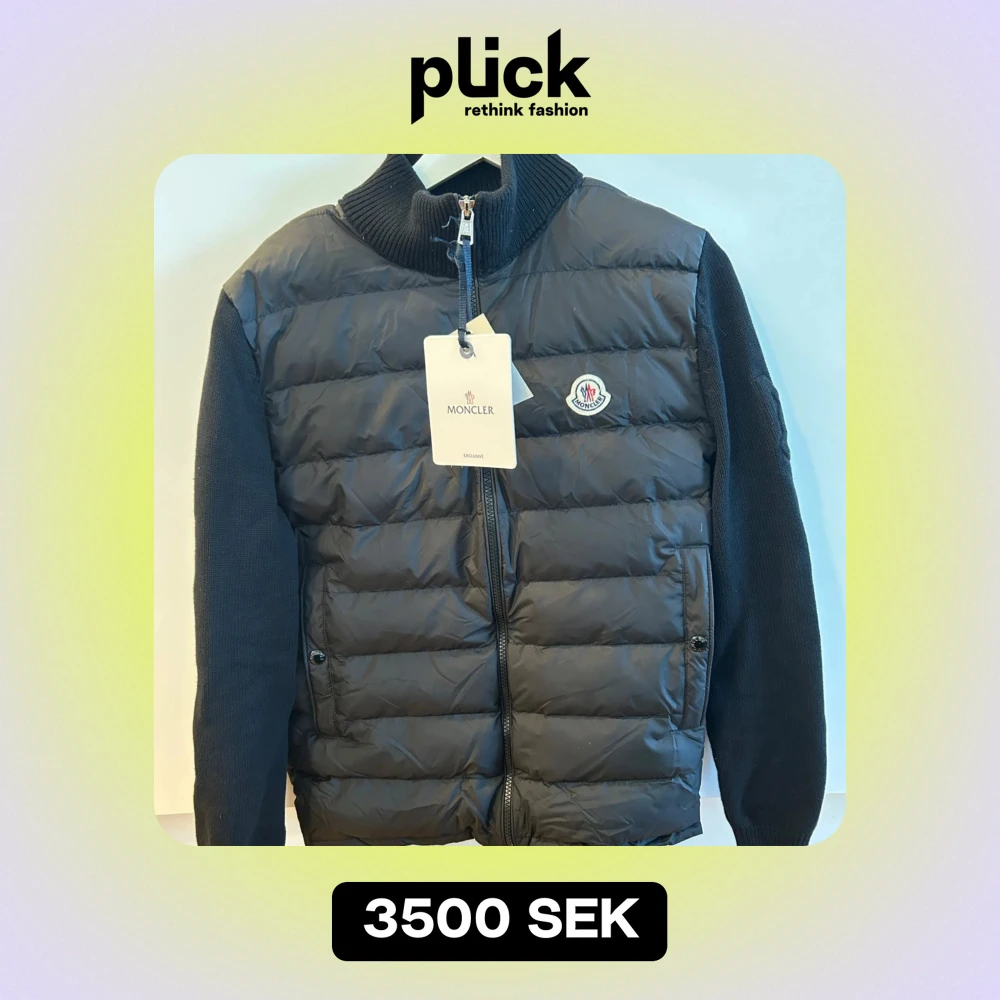 Säljer en snygg svart Moncler jacka i mycket bra skick. Storlek M men sitter som S. Den har en quiltad framsida med dragkedja och stickade ärmar. Perfekt för höst och vinter! Jackan har en klassisk Moncler-logga på bröstet och en ribbad krage för extra stilpoäng.