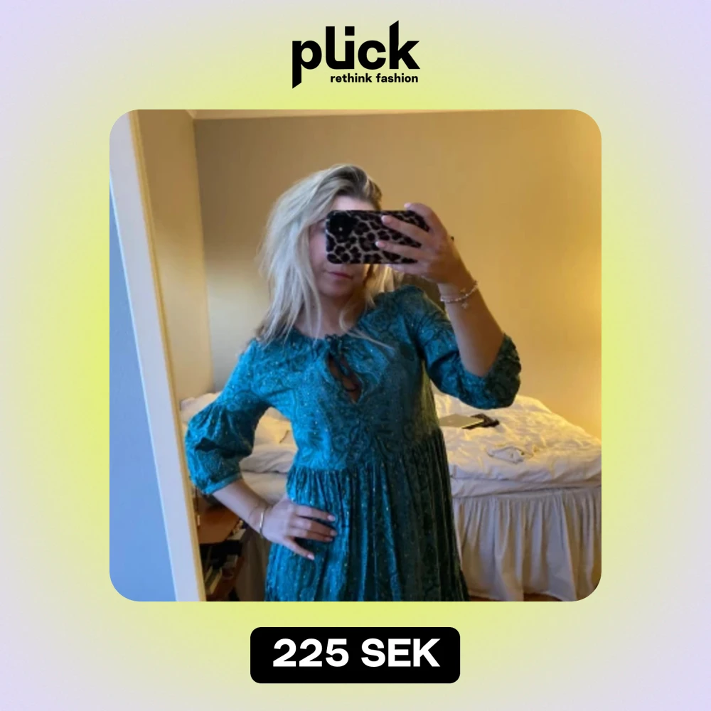 Säljer denna jättesnygga klänning från zara med trekvartsärm!! Jättefin blå/grön färg med guldiga detaljer!🥰 jag är ca 160 som referns och har vanligtvis S❣️