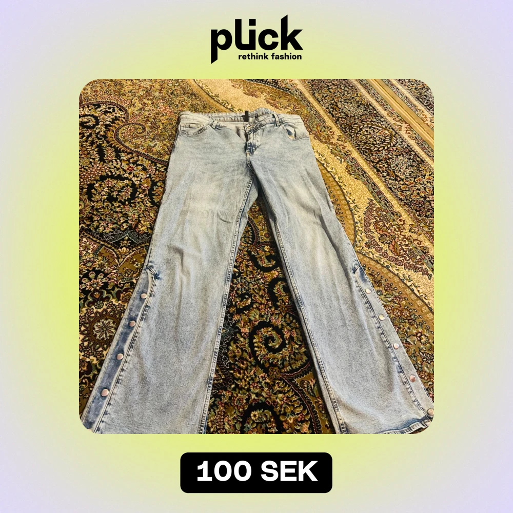 Säljer ett par ljusblå jeans från H&M Divided i storlek L. De har en loose fit och är dekorerade med knappar längs sidorna för en cool detalj. Perfekta för en avslappnad stil och passar bra till både vardag och fest. 🕺