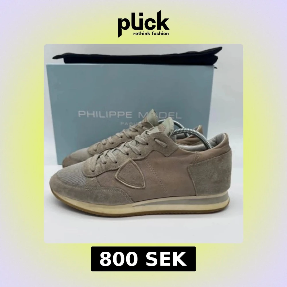Snygga beige sneakers från Philippe Model storlek 40 men passar 41. Skorna har snörning och är tillverkade i mocka och syntetmaterial. Perfekta för en avslappnad stil. Box och påse kommer inte med