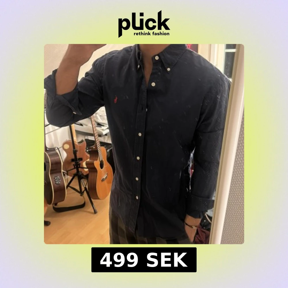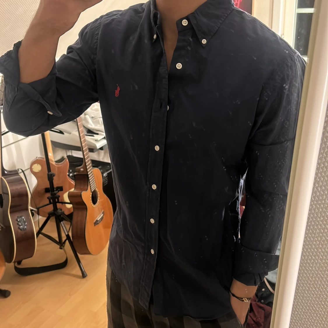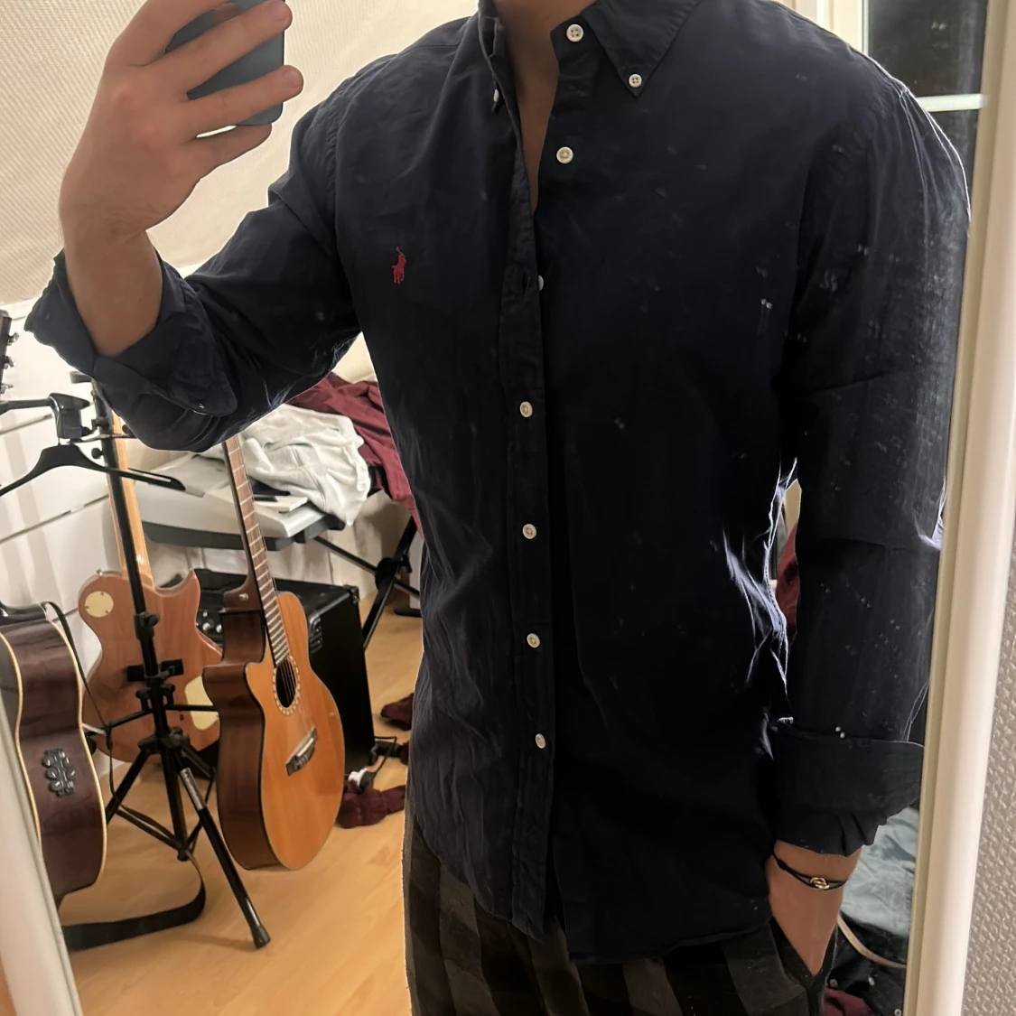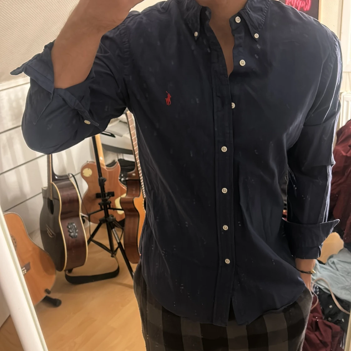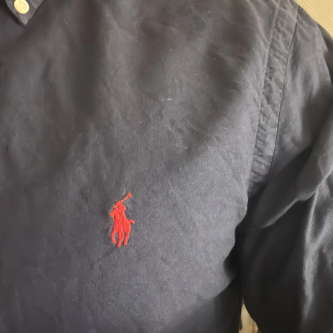 Snygg mörkblå skjorta från Ralph Lauren med klassisk krage och knappar framtill. Skjortan har ett rött broderat märke på bröstet och långa ärmar. Perfekt för en stilren look.