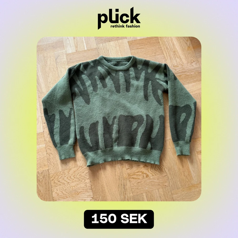 Säljer en cool grön stickad tröja med ett unikt mönster i mörkare grönt. Tröjan har långa ärmar och ribbade muddar vid ärmslut och nederkant. Perfekt för att hålla sig varm och stilren under kyliga dagar. Passar både till vardags och lite mer avslappnade tillfällen.