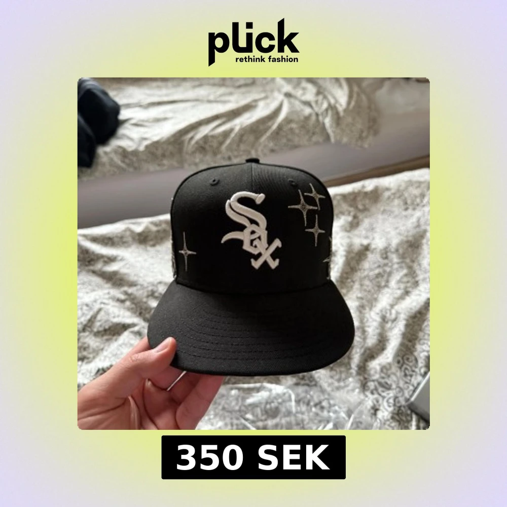 Snygg svart keps från New Era med broderade stjärnor och solmotiv. Kepsen har en platt skärm och ett klassiskt logotypbroderi framtill. Perfekt för att ge din outfit en unik touch. I väldigt bra skick bara lite avfärgad inne från kepsen vid den delen som ska vara på pannan annars i toppskick