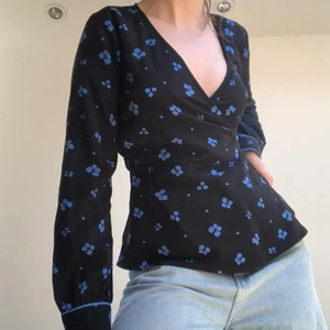 Blommig omlottblus - Säljer en söt blommig blus med volangdetaljer. Blusen har en v-ringad design och korta ärmar. Perfekt för vår och sommar!