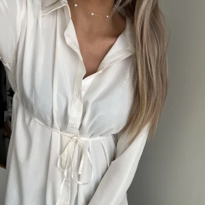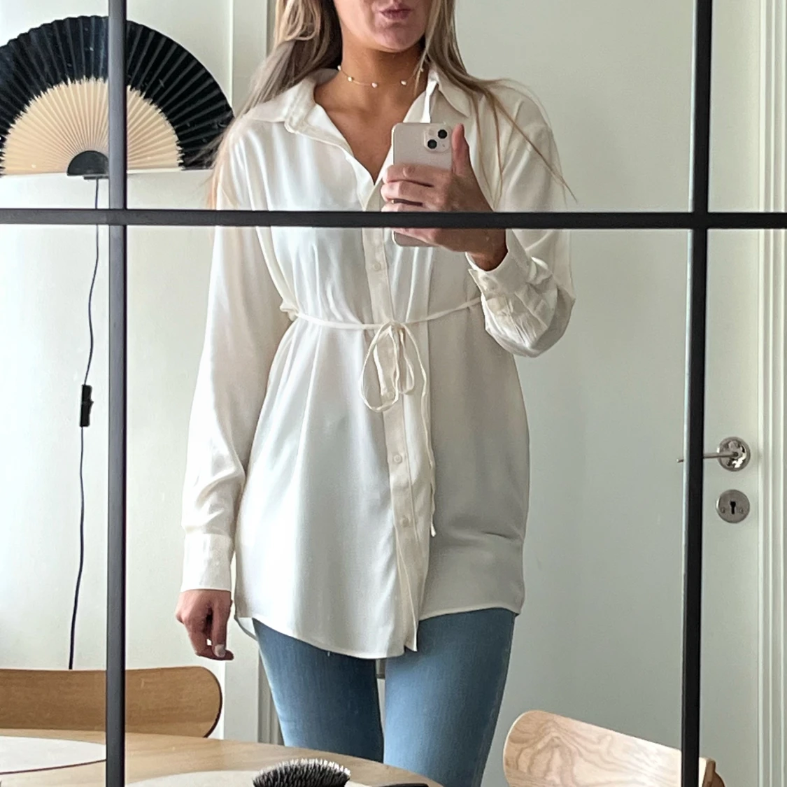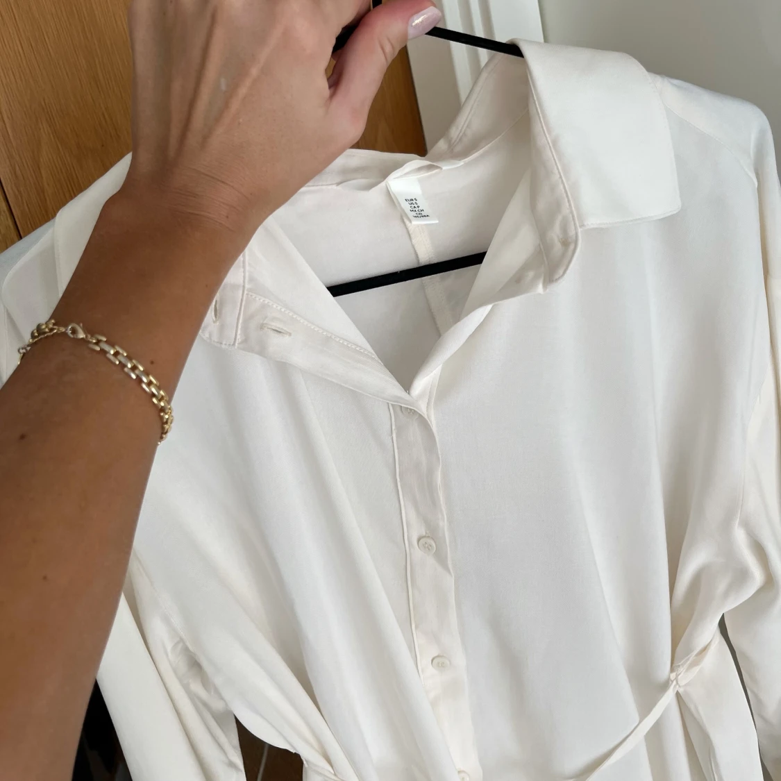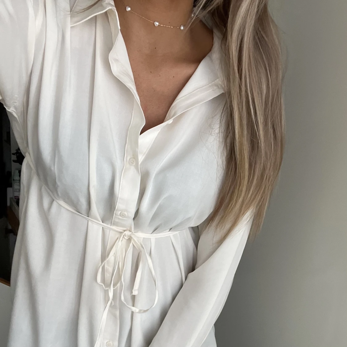 Crèmevit skir skjorta från H&M i lång modell med smalt knytband som knyts under bysten, som ny! Använd EN gång. Storlek S. 100% viskos. Längd: 77cm.