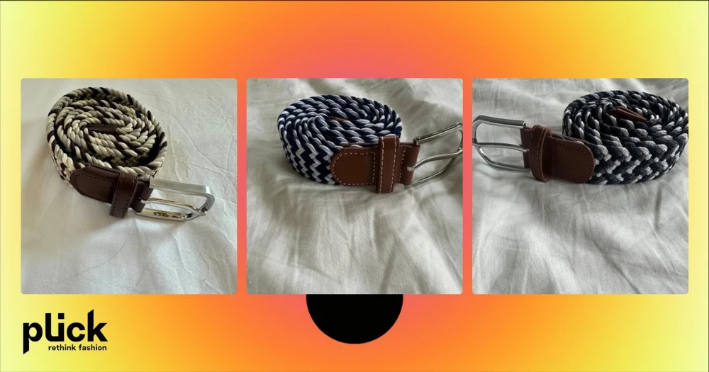Mörkblå flätad bälte med skinn - Snyggt mörkblått flätat bälte med detaljer i brunt skinn och vit söm. Spännet är i silverfärgad metall och bältet har en flexibel, vävd struktur som gör det bekvämt att bära. Perfekt för att ge din outfit en stilren touch.