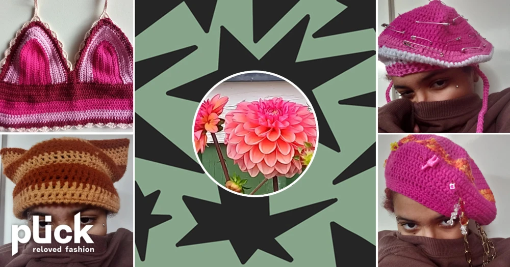 Virkad basker med smyckad ovansida - Har två snören man kan knyta under och sitter bekvämt på mig som har en huvudomkrets på ca 60 cm.
