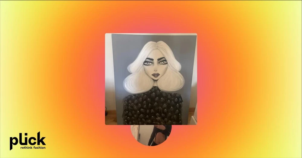 Målning av kvinna med vitt hår - Stilren målning av en kvinna med långt, vitt hår och intensiv blick. Bakgrunden är grå och klädseln är mörk med detaljer som liknar fjädrar. Perfekt för att ge rummet en modern och mystisk känsla. Köpt för 5000kr av en konstnär. Pris går att diskuteras/prutas. :)