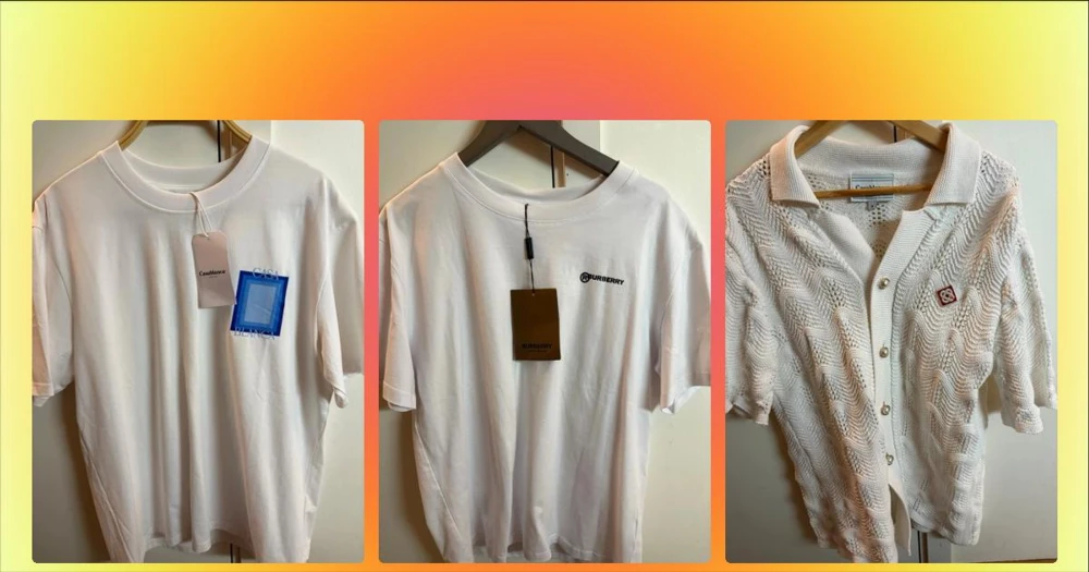 Vit Burberry t-shirt med tryck - Vit t-shirt från Burberry med svart logga på bröstet och ett stort statement-tryck på ryggen: 'Don't believe everything you think'. Klassisk rund hals och korta ärmar. Tillverkad i mjuk bomull för en skön och avslappnad look.