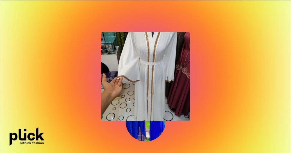 Vit långklänning med guldiga detaljer - Elegant vit långklänning med vida ärmar och vackra guldiga paljettband längs kanterna och ärmsluten. Klänningen har ett knytband i midjan och dekorativa pärldetaljer längs v-ringningen. Perfekt för dig som vill sticka ut med stil.