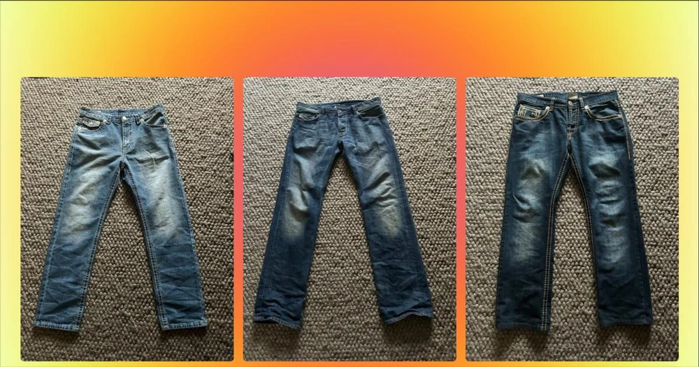 True Religion blå jeans Joey super T modell - Säljer ett par blå jeans från True Religion med tydliga vita kontrastsömmar och snygga detaljer på fickorna. Modellen har klassiska fem fickor, knappar i kopparfärg och logopatch bak. Materialet är jeans och passformen är rak med normal midja. Nästan nyskick då jag använt dom en endaste gång.