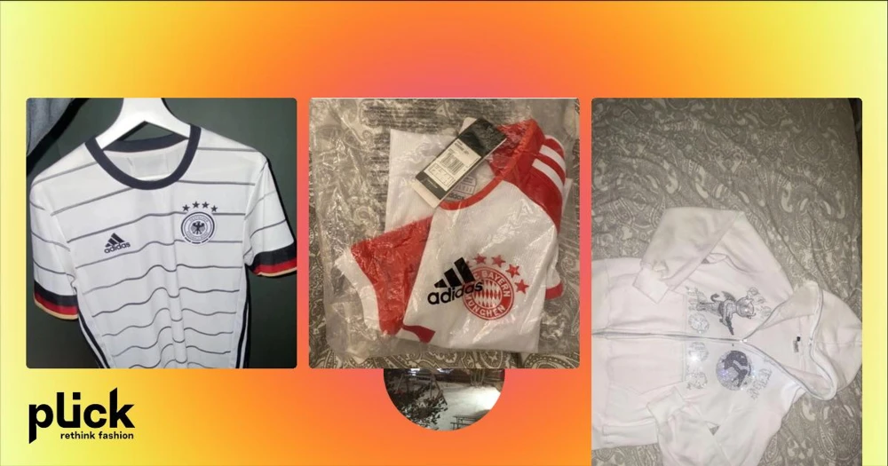 Vit och svart fotbollströja från Adidas - Säljer en snygg vit fotbollströja från Adidas med svarta ränder och Tysklands emblem på bröstet. Tröjan har korta ärmar med ränder i svart, rött och gult. Perfekt för fotbollsfans! 🏆