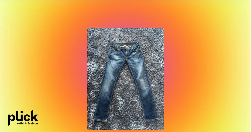 Blå slim jeans från Nudie Jeans - Säljer ett par blå slim fit jeans från Nudie Jeans med klassisk femficksdesign och snygga slitningar på framsidan. Jeansen har en ganska slimfit passform och är tillverkade i denim med kontrastsömmar och läderpatch bak. Perfekta för dig som gillar en modern och stilren look. OBS STORLEK - W29 L32