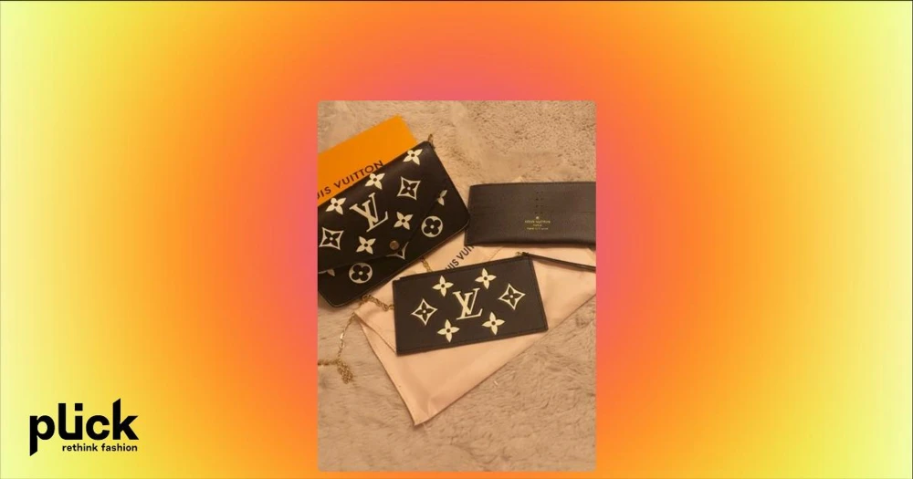 Louis Vuitton svart kuvertväska med kedja - Svart kuvertväska från Louis Vuitton med ikoniskt monogrammönster i vitt. Väskan har guldfärgad kedja och detaljer, samt matchande plånbok och korthållare. Tillverkad i skinn med tryckknapp framtill och snyggt LV-emblem. Perfekt för dig som gillar lyxiga accessoarer.