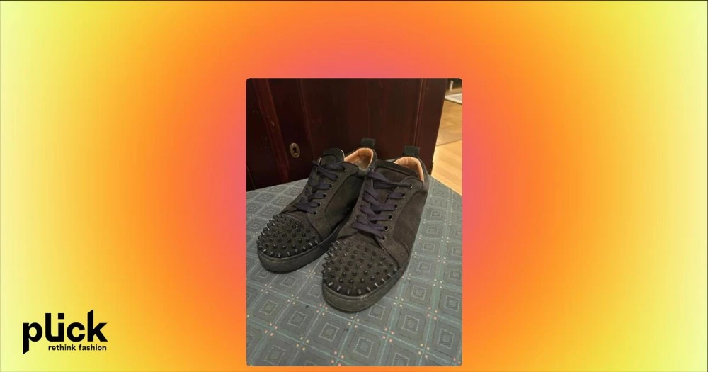 Christian Louboutin  - Säljer ett par mörkblåa sneakers i mocka från Christian Louboutin med coola svarta nitar på tån och klassisk röd sula. Skorna har svarta snören och en låg profil. Insidan är beige och materialet känns lyxigt och mjukt. En nit saknas men syns inte