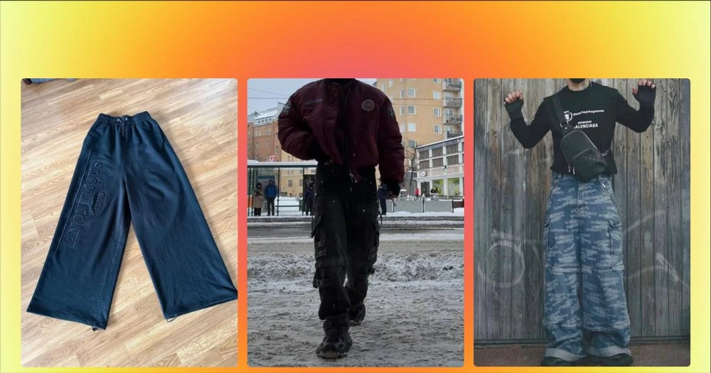 Vetements All-Over Logo Transformer Cargo Jeans - Säljer ett par riktigt baggy cargobyxor från Vetements i blå denim med all-over logoprint. Byxorna har flera stora fickor på sidorna och bred passform för en avslappnad streetwear-look. Perfekta för dig som gillar statement-plagg och vill sticka ut.